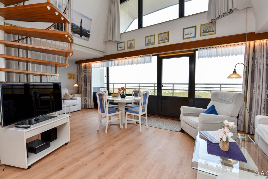 Aus der Admirals-Suite im 4. OG haben Sie direkte Seesicht auf den Weltschifffahrtsweg. Lassen Sie den Blick aus dem großzügigen Wohn- und Essbereich sowie der Küche durch das gebogene Panoramafenster über die Nordsee schweifen, während Sie frühstücken oder den Tag bei einem Glas Wein ausklingen lassen.
